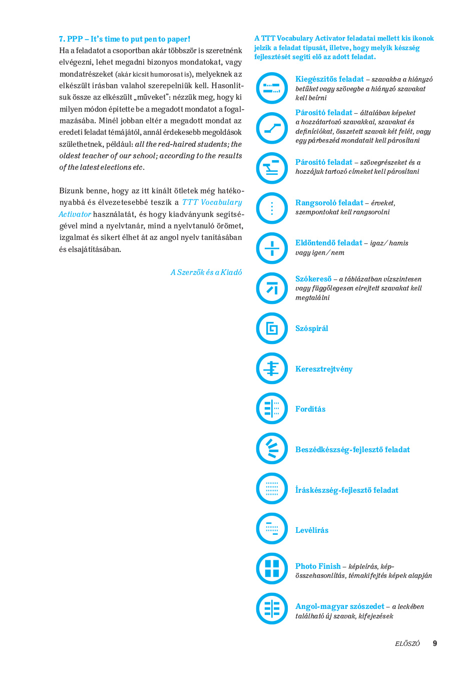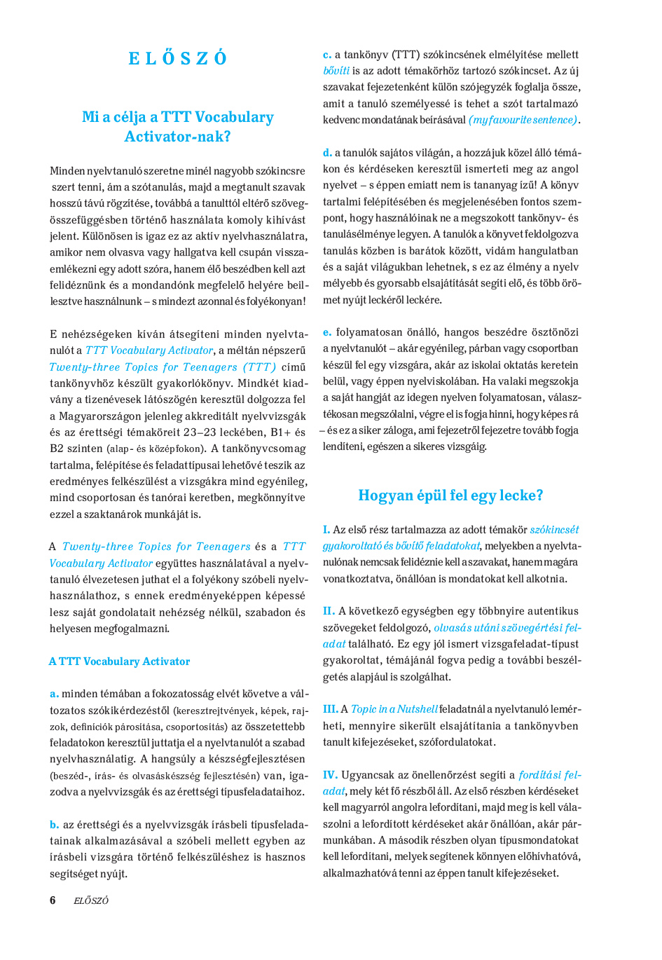 A két, írásbeli és szóbeli feladatokat tartalmazó könyv a Twenty-three Topics for Teenagers (TTT) témáinak szókincsét gyakoroltatja. A TTT és a hozzá kapcsolódó TTT Vocabulary Activator két kötetének felépítése azonos, ami lehetővé teszi a kiadványok párhuzamos feldolgozását, s így az alaposabb és élvezetesebb nyelvtanulást.