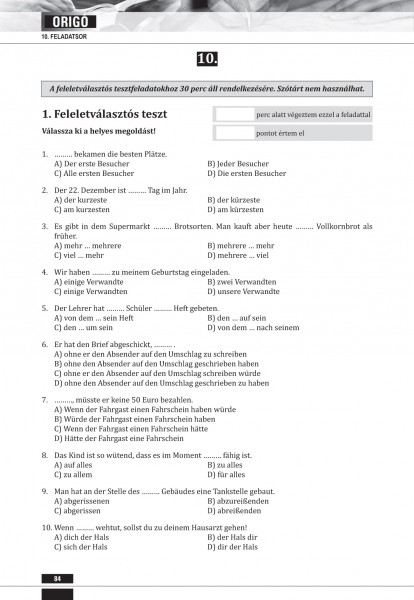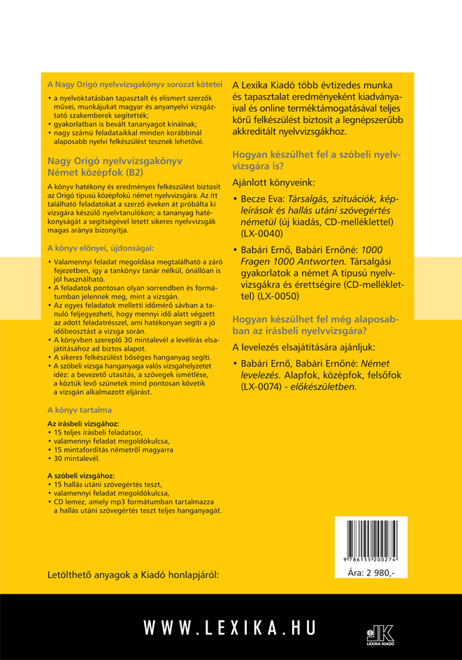 A könyv a sikeres Origó típusú középfokú német nyelvvizsgához vezető legrövidebb út. A vizsgahű feladatsorok a bőséges hanganyaggal és a megoldókulcsokkal akár önállóan is jól feldolgozhatók.